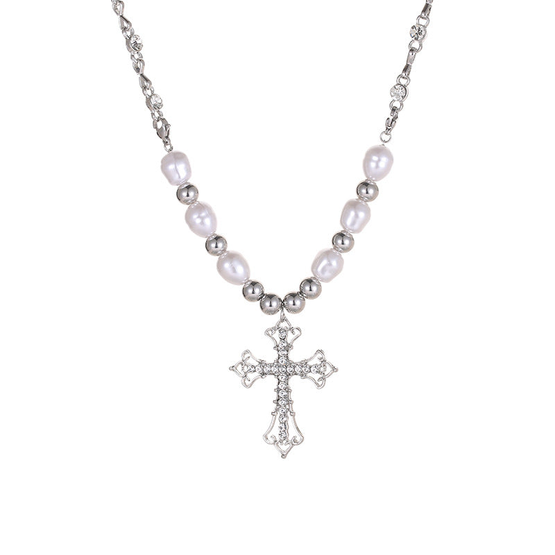 Stainless Steel Retro Cross-border Pendant Pearl Beaded Necklace /KJ0157