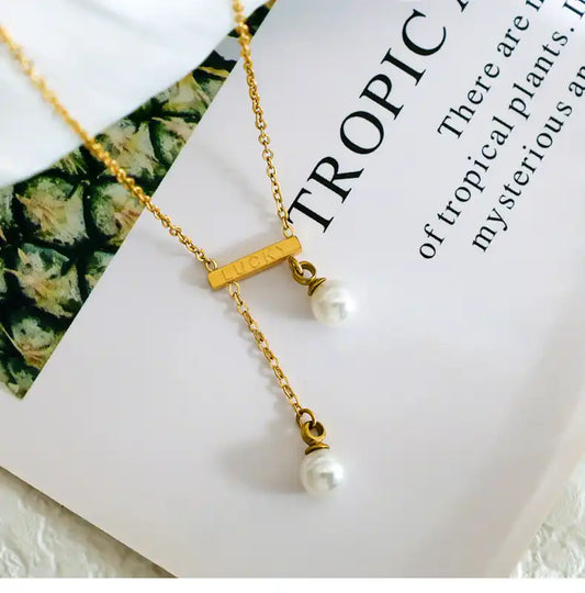 LUCKY Engraved Bar Pearl Tassel Pendant Necklace / 25004040
