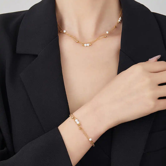 Stainless Steel Double-layer pearl laser ball stacking necklace and Bracelet / 25004022
