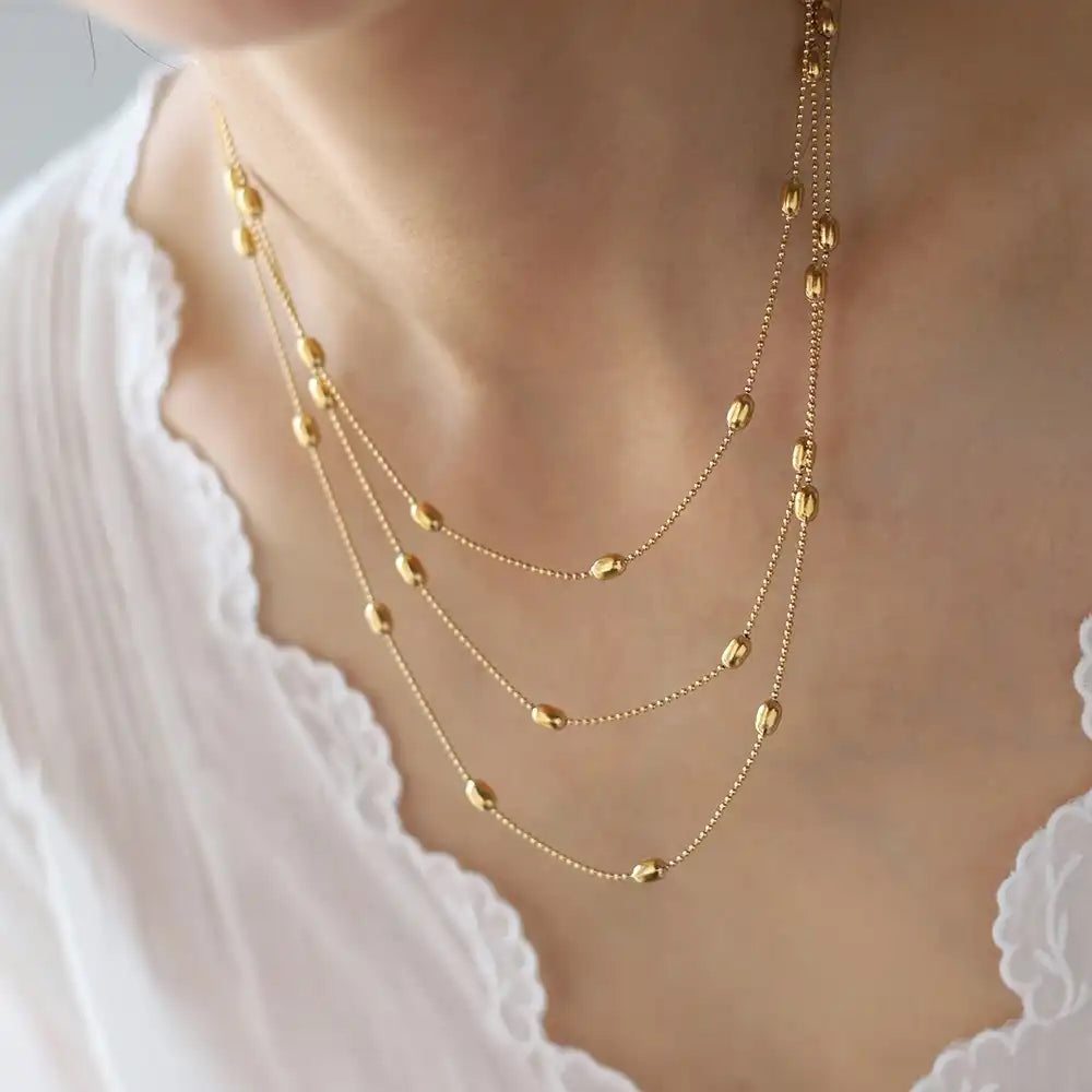 Titanium steel Golden oval rice beaded three - layer stacked necklace / 25004006