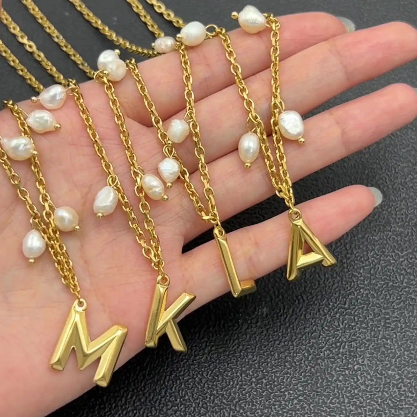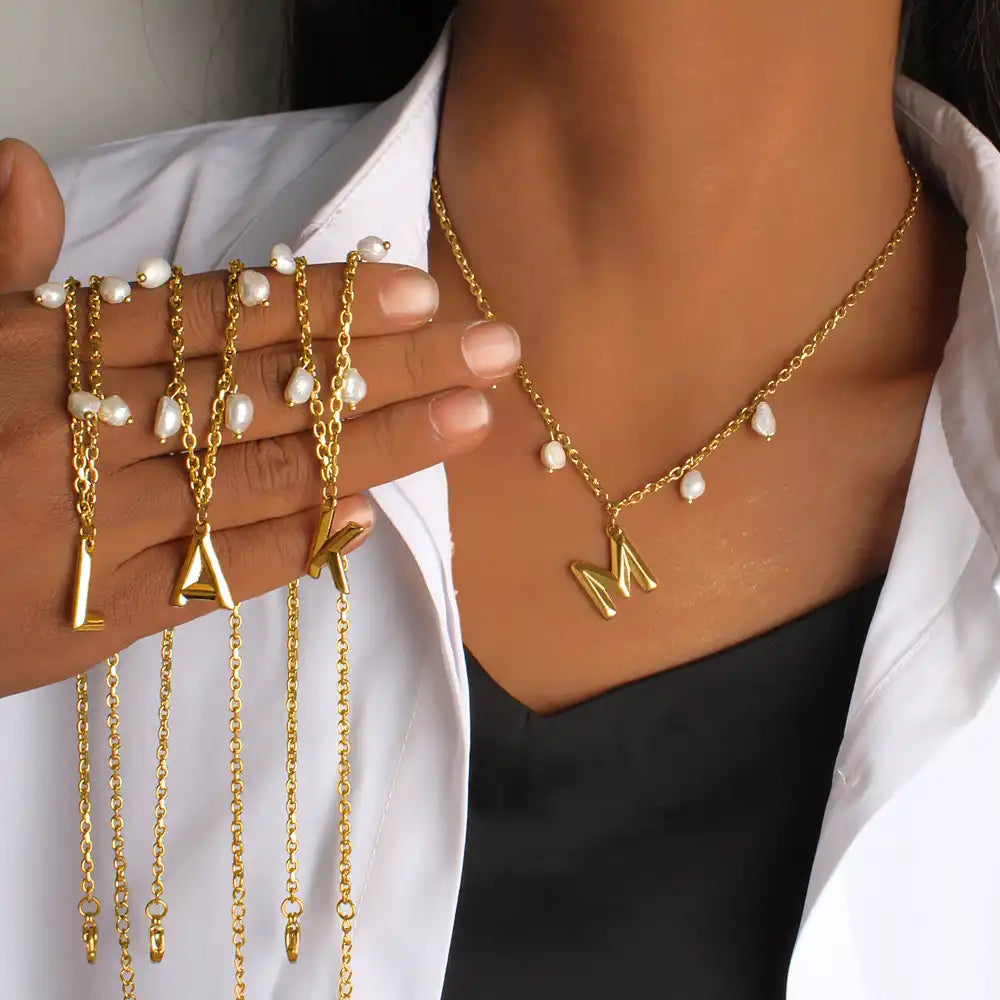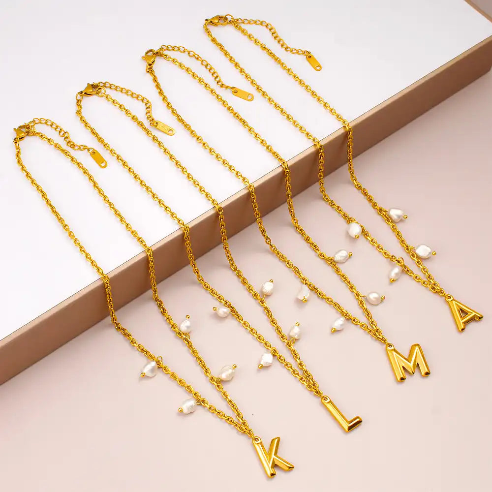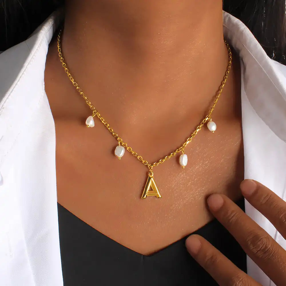 Titanium steel letter pendant Pearl Charm necklace / 25003052